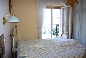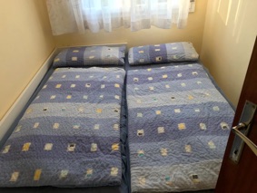 Das Schlafzimmer hat ein Doppelbett mit getrennten Matratzen und einem grossen Wandschrank.