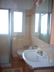 Das Bad umfasst eine Dusche, ein WC und ein Waschbecken und mit Elektrostrahler über der Badtüre ausgestattet.